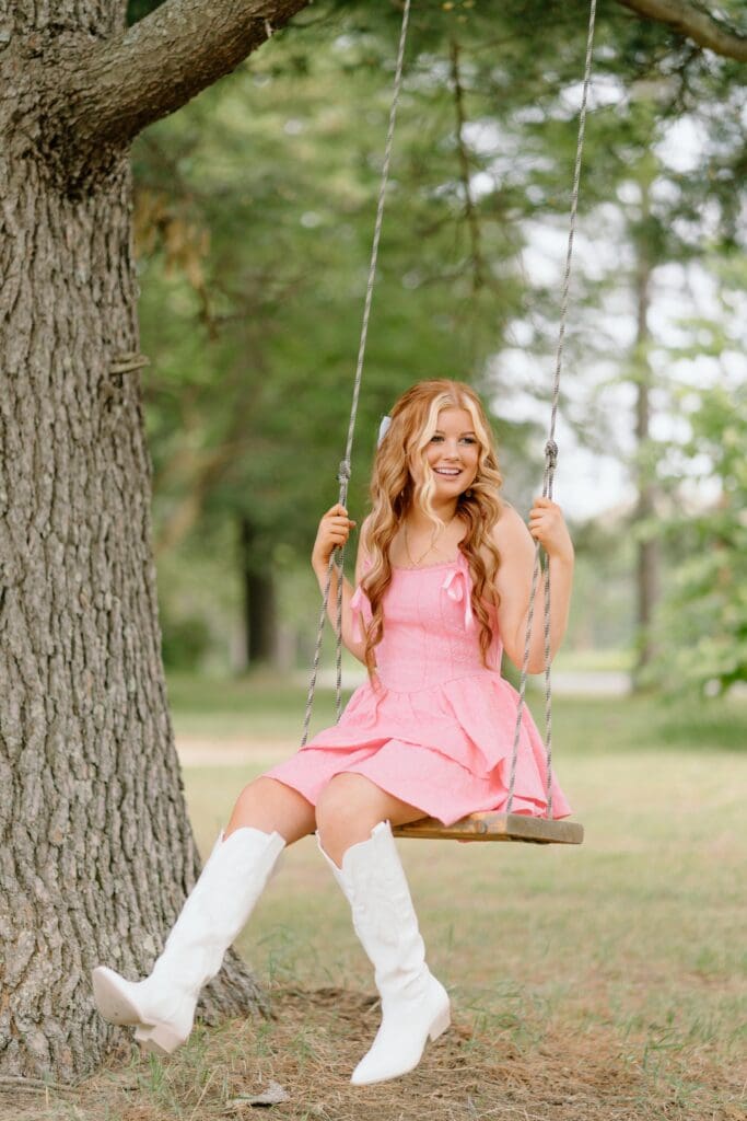 We started near the barn with Autumn in a pink dress and cowboy boots (obsessed). The contrast between the weathered wood and her soft outfit was so good. We wandered around the property finding little gems—like a white fence that gave major small-town-country vibes, and a swing hanging from an old tree that felt straight out of a movie.