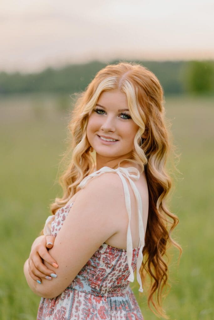 After that, we walked out into the field behind the barn just as the sun started to dip. The sky turned golden and everything lit up with that soft glow that photographers dream of. It was such a sweet way to end the session, just calm, pretty, and totally her.